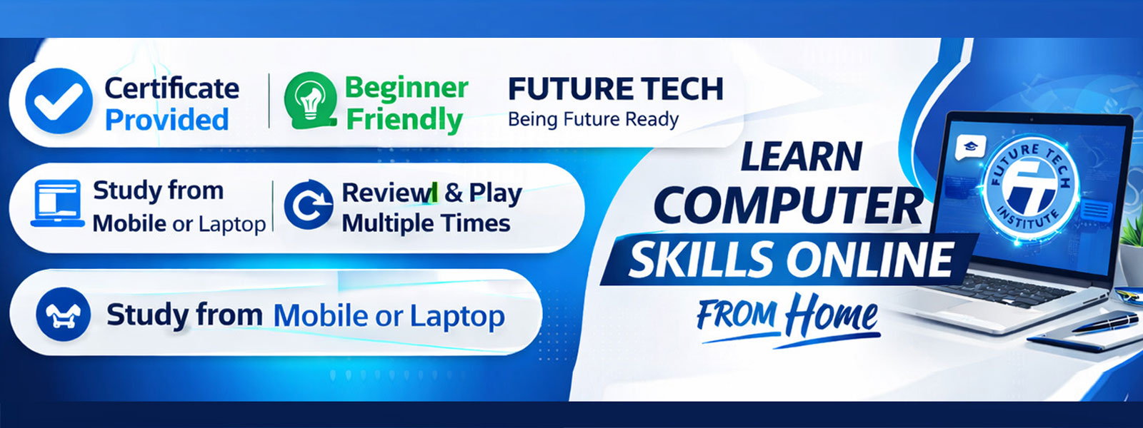 Learn computer basics, internet, typing, MS Word, Excel, and PowerPoint.
